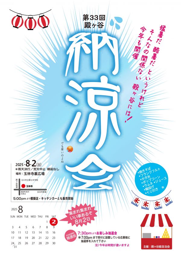 殿ヶ谷組では、「第33回殿ヶ谷納涼会」を令和7年8月2日(土)に玉林寺裏広場で開催します。
