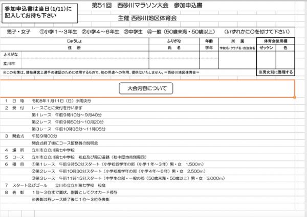 大会の申込書については、3校(七中、西砂小、松中小)、各自治会、少年野球・少年サッカーのチームに配布しましたので、必要事項を記入の上、当日七中グランドにお持ちください。