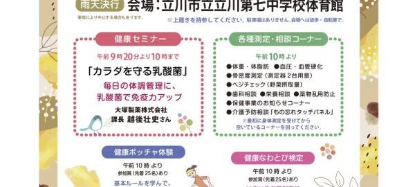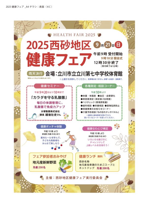 「2025西砂地区健康フェア」が、9月21日(日)9:00より立川市立第七中学校体育館で開催されます。