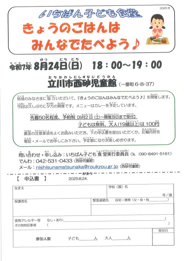 予約お申し込み・お問い合わせは、いちばん子ども食堂実行委員会 (西砂児童館)まで。