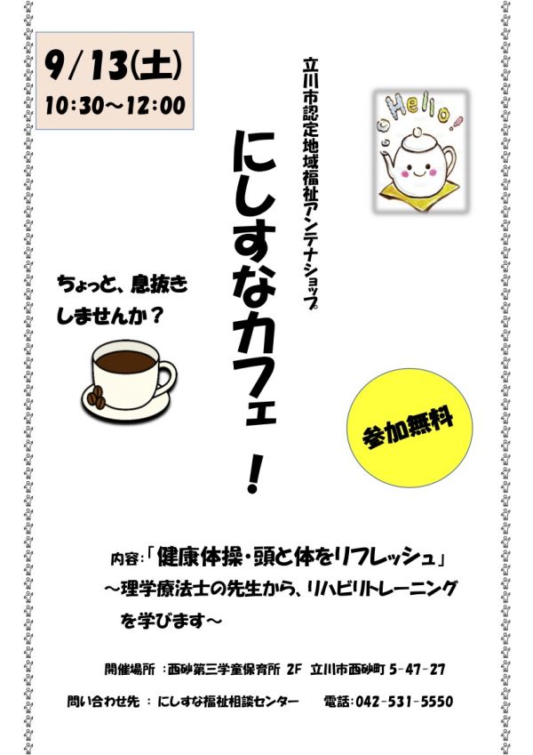 令和7年9月13日(土)10:30〜12:00開催の「にしすなカフェ」は「健康体操・頭と体をリフレッシュ」です(8月はお休みさせていただきます)。