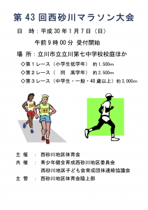 西砂地区に春を告げる「第43回西砂川マラソン大会」は、1月7日(日)開催です。