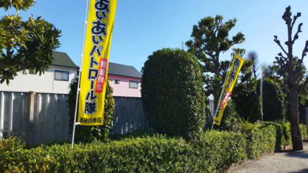 また中里公会堂、西砂第二公園には、あいあいパトロール隊のぼり旗を掲出。地域の防犯態勢をアピール。