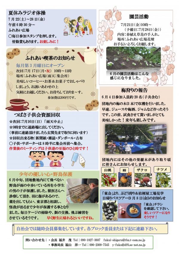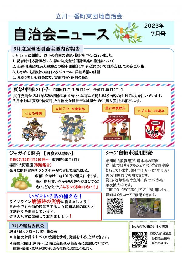 西砂川ニュース:東団地「自治会ニュース7月号」近づく夏祭り こども神輿も練り歩く 2023年6月30日自治会、西砂川ニュース鈴木英樹 立川一番町東団地自治会では、毎月「自治会ニュース」を発行(500部)。全居住者世帯に配布しています。「自治会ニュース7月号」は、7月29日(土)開催の夏祭り詳報、ふれあい喫茶毎月第3月曜日オープンなど、内容充実。ぜひご覧ください。
