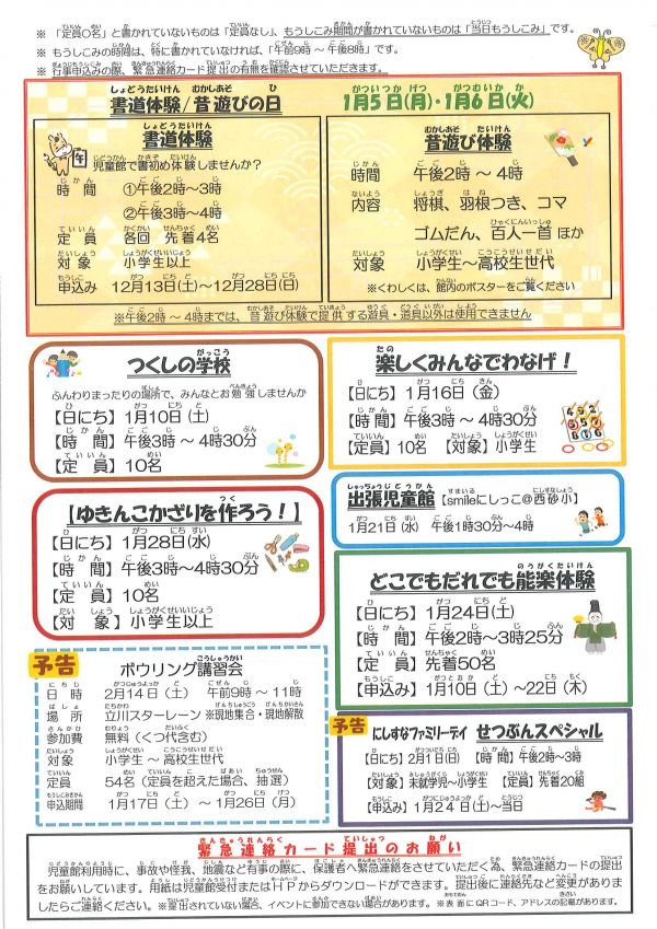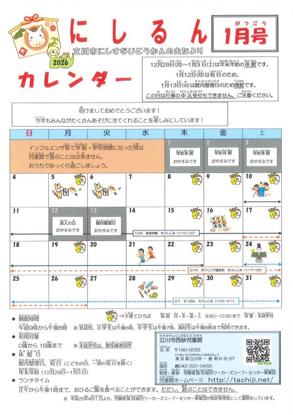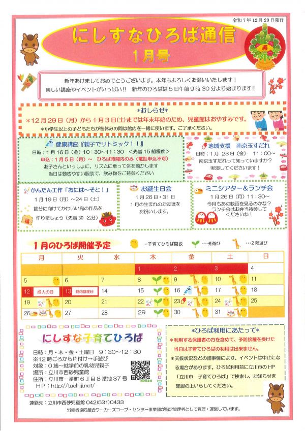 「西砂児童館」「にしすな子育てひろば」では、令和8年1月もさまざまな企画でにしすなの街を盛り上げます。