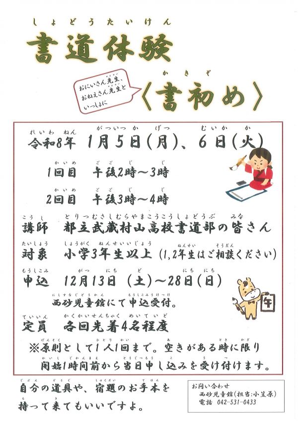 西砂川ニュース:西砂児童館は「書初め」「能楽」など新春にふさわしいイベント開催