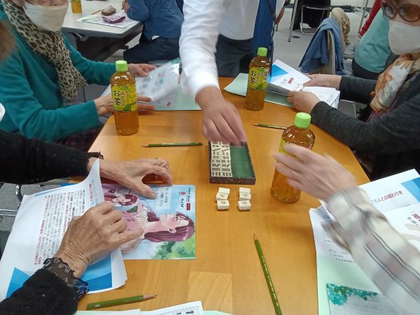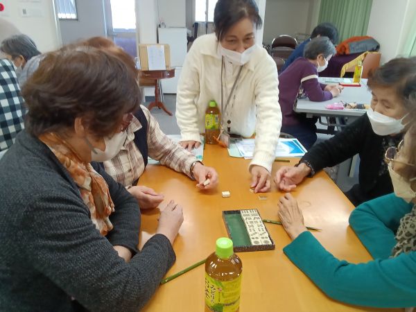 ペアになって目をつぶり「人」「入」「手」「干」と手のひらに書いてみたり、麻雀牌を裏返し、どの牌を触っているか当てるゲームを各テーブルで行ない、いつもと違う盛り上がりがありました。