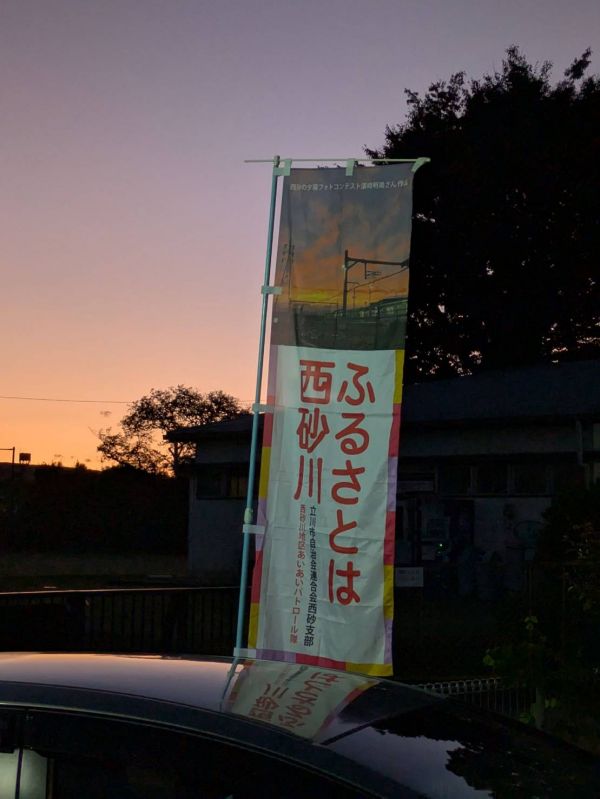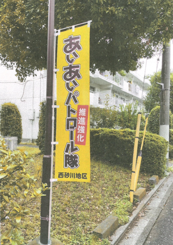 レクセルガーデン武蔵砂川自治会では、令和7年10月5日(日)から10月31日(金)まで、あいあいパトロール隊のぼり旗を掲出。防犯態勢をアピールしました。
