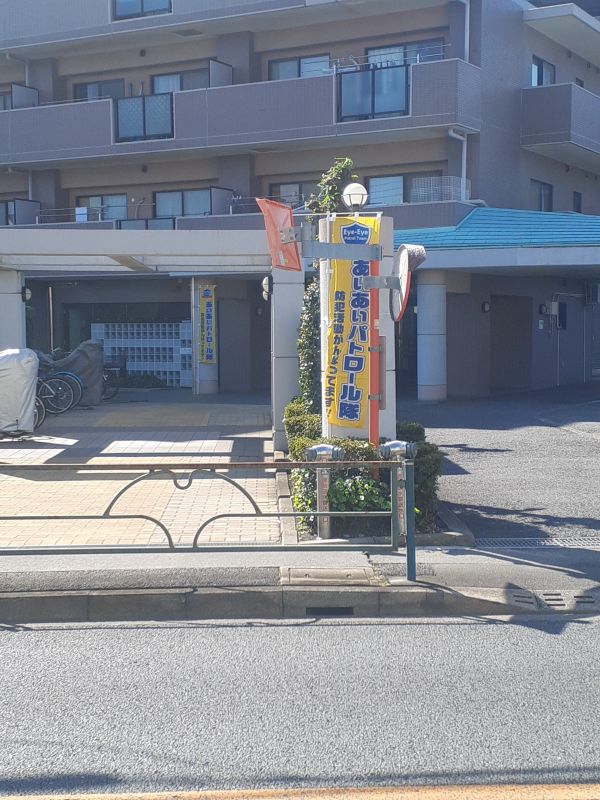 立川一番町東団地自治会では、令和7年9月13日(土)から9月27日(土)まで、自治会内にあいあいパトロール隊のぼり旗を掲出。地域の防犯態勢をアピールしました。