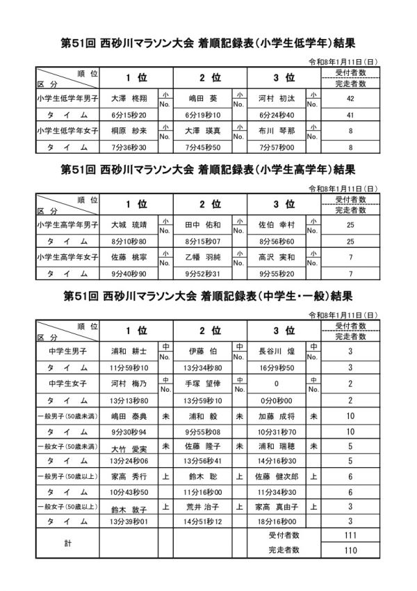 西砂川ニュース:入賞者発表!「第51回西砂川マラソン大会」111名の選手が覇を競う