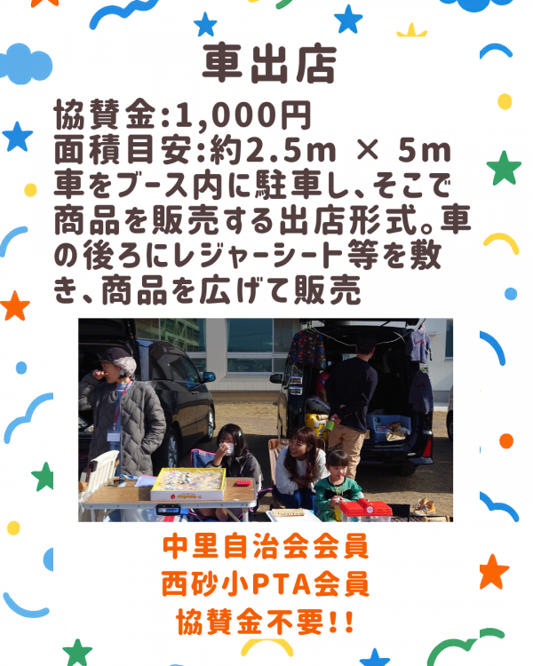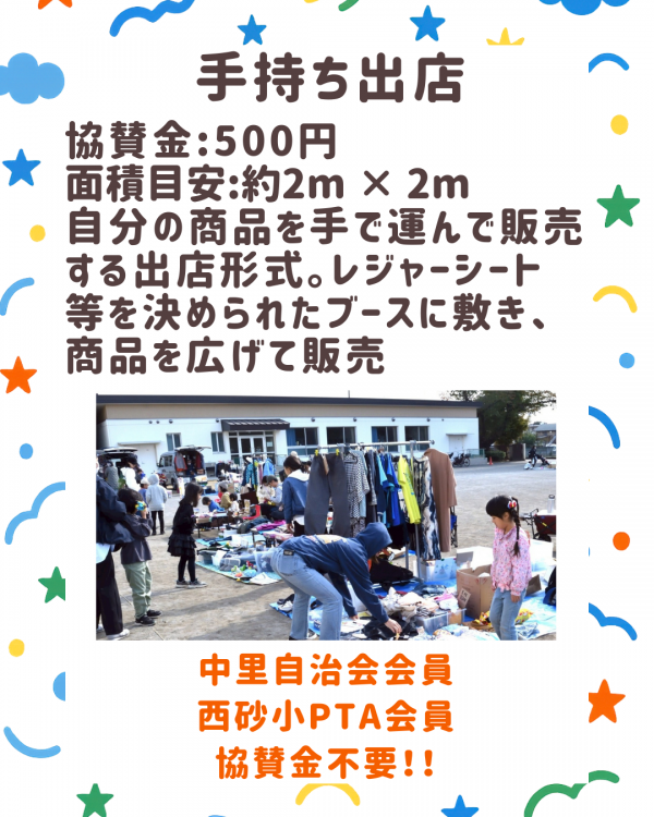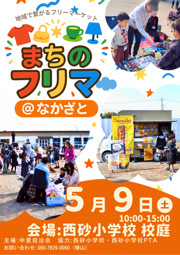 中里自治会主催、西砂小学校、西砂小PTA協力により、令和8年5月9日(土)に西砂小学校校庭で「第2回まちのフリマ@なかざと」が開催されます。