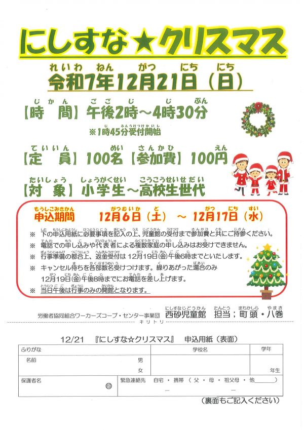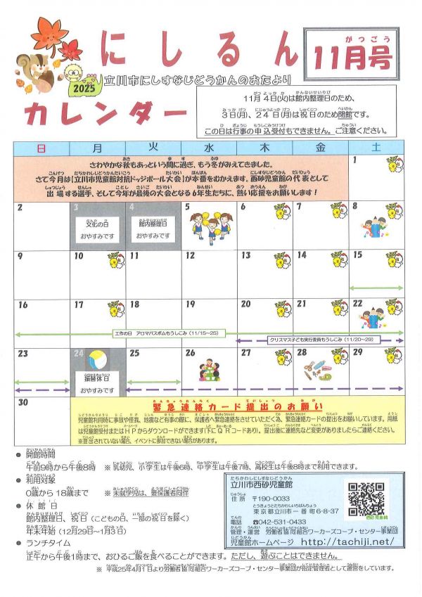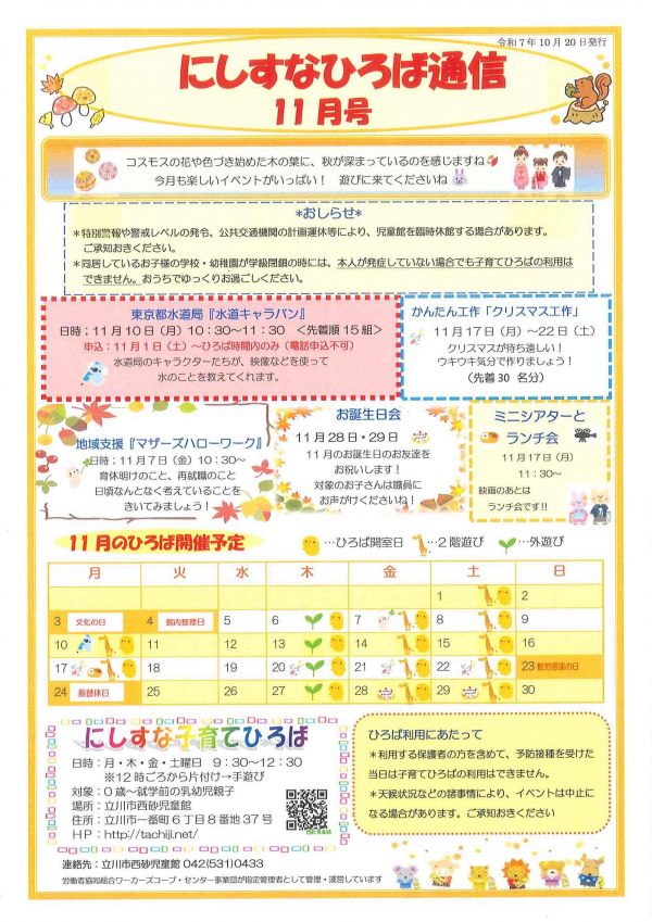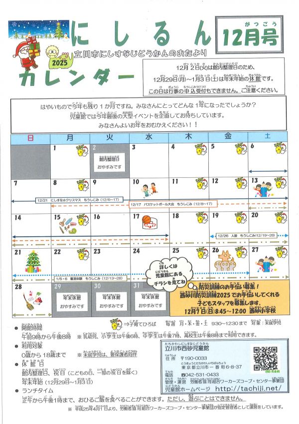 「西砂児童館」「にしすな子育てひろば」では、12月もさまざまな企画でにしすなの街を盛り上げます。