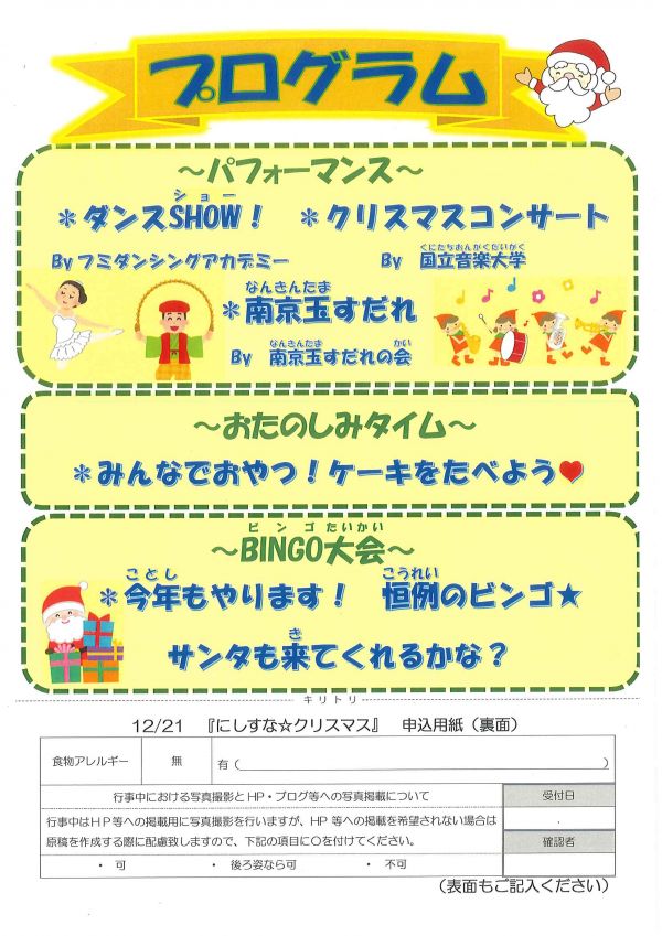 12月21日(日)には、「にしすな☆クリスマス」を開催。ダンスSHOW、クリスマス・コンサート、ビンゴ大会などお楽しみいっぱい。