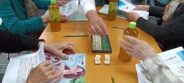 ペアになって目をつぶり「人」「入」「手」「干」と手のひらに書いてみたり、麻雀牌を裏返し、どの牌を触っているか当てるゲームを各テーブルで行ない、いつもと違う盛り上がりがありました。