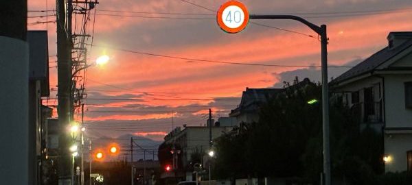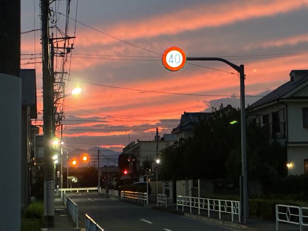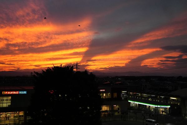 駅前マンションからの眺望。西砂の街を包み込むように夕空が鮮やかな朱に染まり、日常の風景が一瞬にして劇的な表情を見せています。自然が織りなす色彩のドラマと、地域の暮らしのぬくもりを、絶妙なバランスで捉えた秀作です。