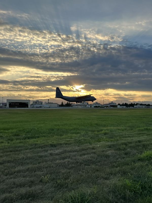 夕陽の下をくぐり抜け横田に帰還する大型輸送機。重量感がすごい。夕空の色合いと、機体のシルエットが調和し、静かな感動を呼び起こします。広がる緑の芝生が作品に奥行きを与えています。航空機マニアにはたまらない一枚です。