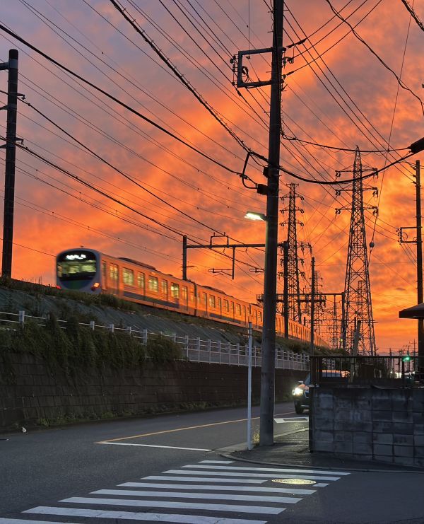 燃えるような夕焼け空を背景に、拝島線が走り抜ける瞬間を鮮やかに捉えた作品です。車両や電線、鉄塔までもオレンジ色に染め上げ、普段見慣れた風景をドラマチックに変えています。猛暑の中、仕事帰りの一コマ。お疲れ様でした。