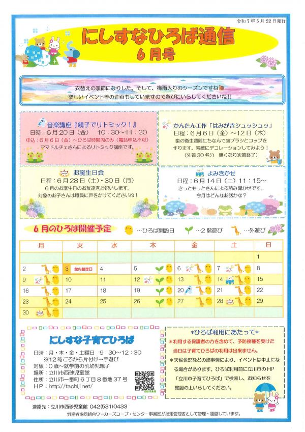梅雨入りのシーズンが近づいてきました。「西砂児童館」「にしすな子育てひろば」では、室内のイベントも充実。