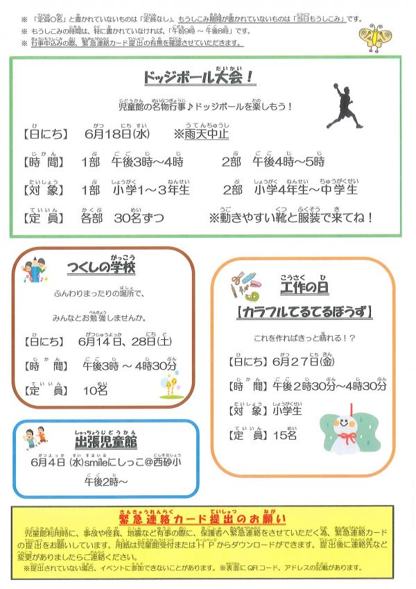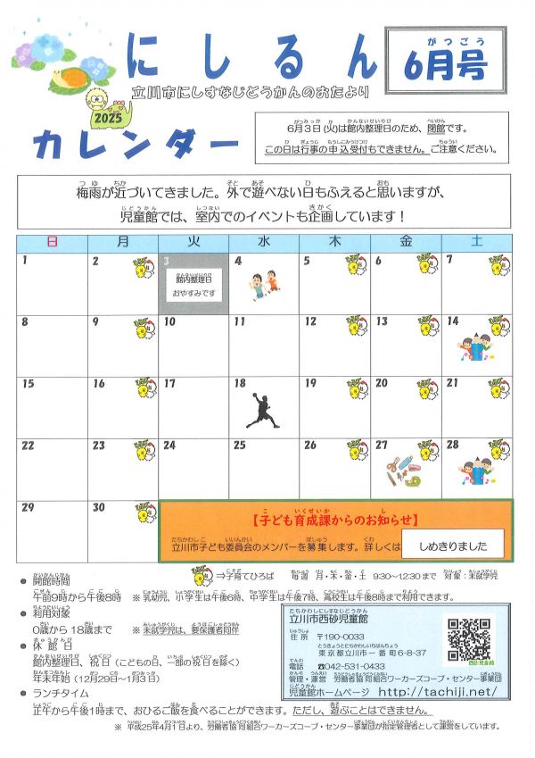 梅雨入りのシーズンが近づいてきました。「西砂児童館」「にしすな子育てひろば」では、室内のイベントも充実。
