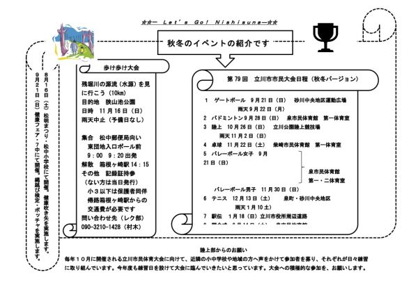 10月13日(月)に七中校庭で開催する「第45回 西砂川地区町民大運動会」を特集。実施種目および内容を紹介しています。